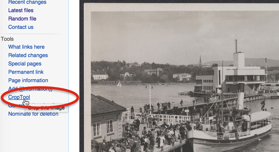 [edit]If the CropTool is not present as a gadget in your local Wikimedia project (like Wikipedia), you can install it (manually in your user JavaScript settings) with following code: