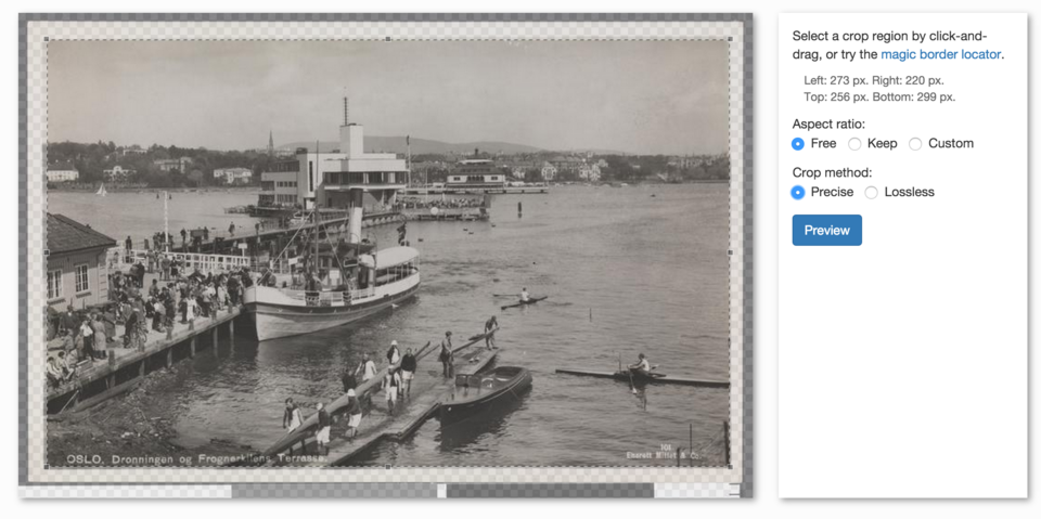 | 4. Make a selection with the cursor and press “Preview”. In this case, we need to make an exact (Precise mode) crop, since we want to keep as much of the image as possible, while removing the border. Note that in many cases an inexact (Lossless mode) is completely sufficient and recommended. |