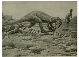 Suddenly he hears the loud bellow of a plant eater ahead. She has heard his crashing and is emitting a warning call. Big Al leaps out of the brush and races onto the plain. Ahead of him, he sees a group of sauropods thundering away. Their gigantic feet pound the earth, sending shockwaves through the ground. They bellow and screech, their young racing beside them. Big Al slows his pace and stops. There is no way he can take down one of these beasts. There are too many of them and he does not have the element of surprise. He must find a different meal.